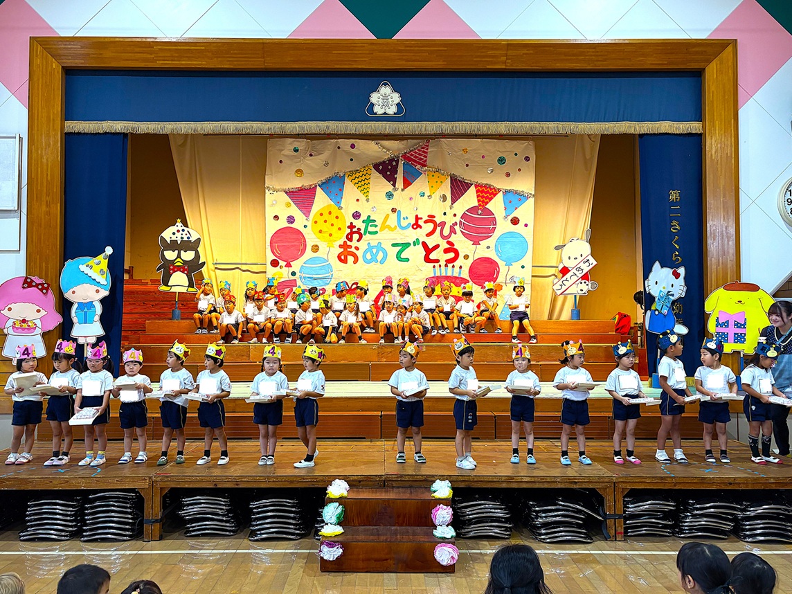 10月3日に10月生まれのお友だちの誕生会を行いました。 お友だちからの歌や、プレゼントを貰って喜ぶ可愛い笑顔が見られ、先生たちからの 出し物もあり、楽しい誕生会になりました(^^♪ 10月生まれのお友だち、誕生日おめでとう!! | ||
